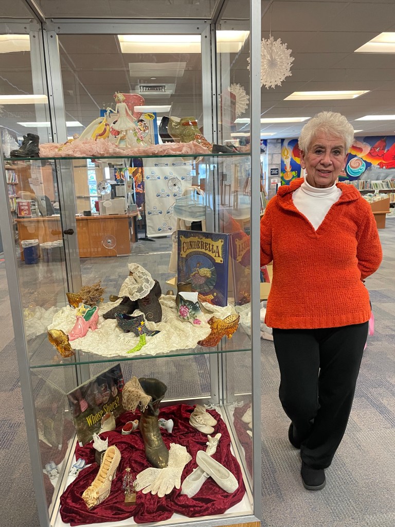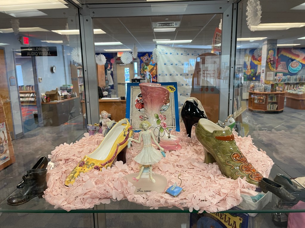 Each month, the Friends and Volunteers decorate a display case in the space near the children’s area. A themed collection is displayed for all to enjoy. Here, Gerri Cusato, former antique shop owner, OC. resident, and F&V member displays her collection of retro and miniature shoes. When asked where she found many of the shoes, she said, “I didn’t find them, they found me”.
