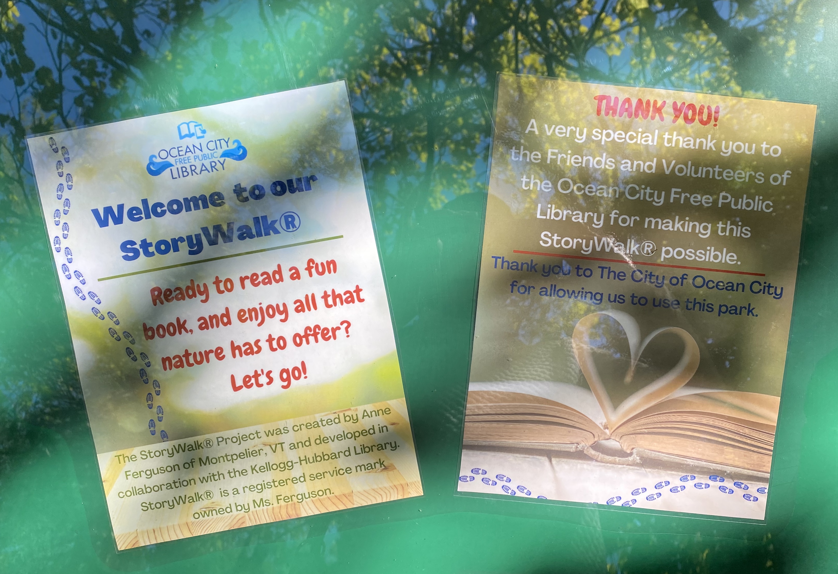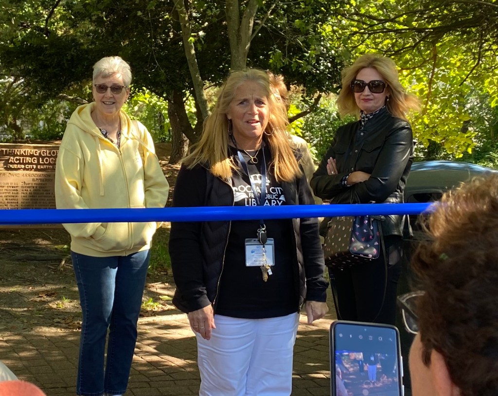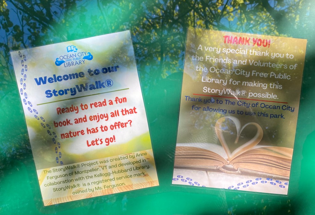 On September 23, 2022, Lake Memorial Park was the site of the grand opening event for the new Story Walk prepared by the staff of the Ocean City Free Public Library and City Workers. The park, located at 407 Wesley Avenue, allows visitors to enjoy a story book as they experience the park. The Friends and Volunteers of the OCFPL provided the funding for the stands and display platforms used to place the book pages around the park for the children and their families to enjoy. F & V member, Cheryl Kelchner, Library Director, Karen Mahar and President of the OCFPL Board of Directors, Jennifer Shirk prepare to cut the ribbon to open the story walk.Gemma and Chris Venturi enjoyed the story walk.