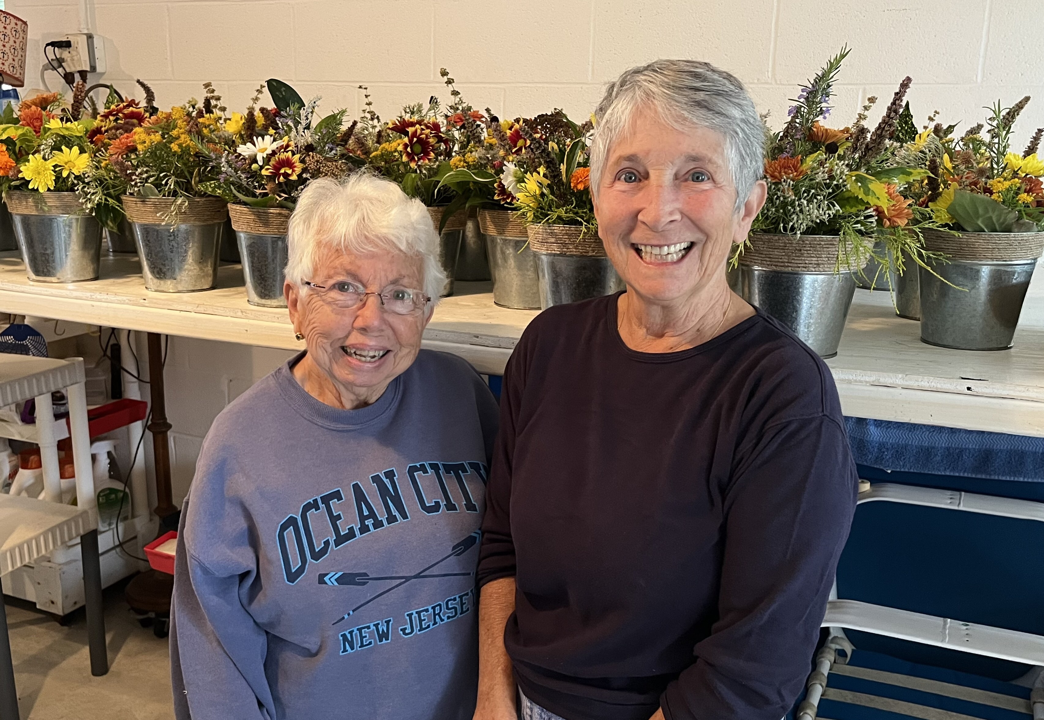 Angel Smith and Jane Claypool head the committee preparing the centerpieces for the luncheon.