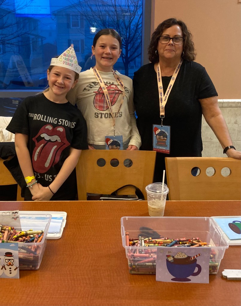 One of the functions of the Friends and Volunteers organization is to support the library in community activities. Here F & V member, Cheri Venturi, and her granddaughters Mia and Elise help at the craft table during First Night activities at the library.