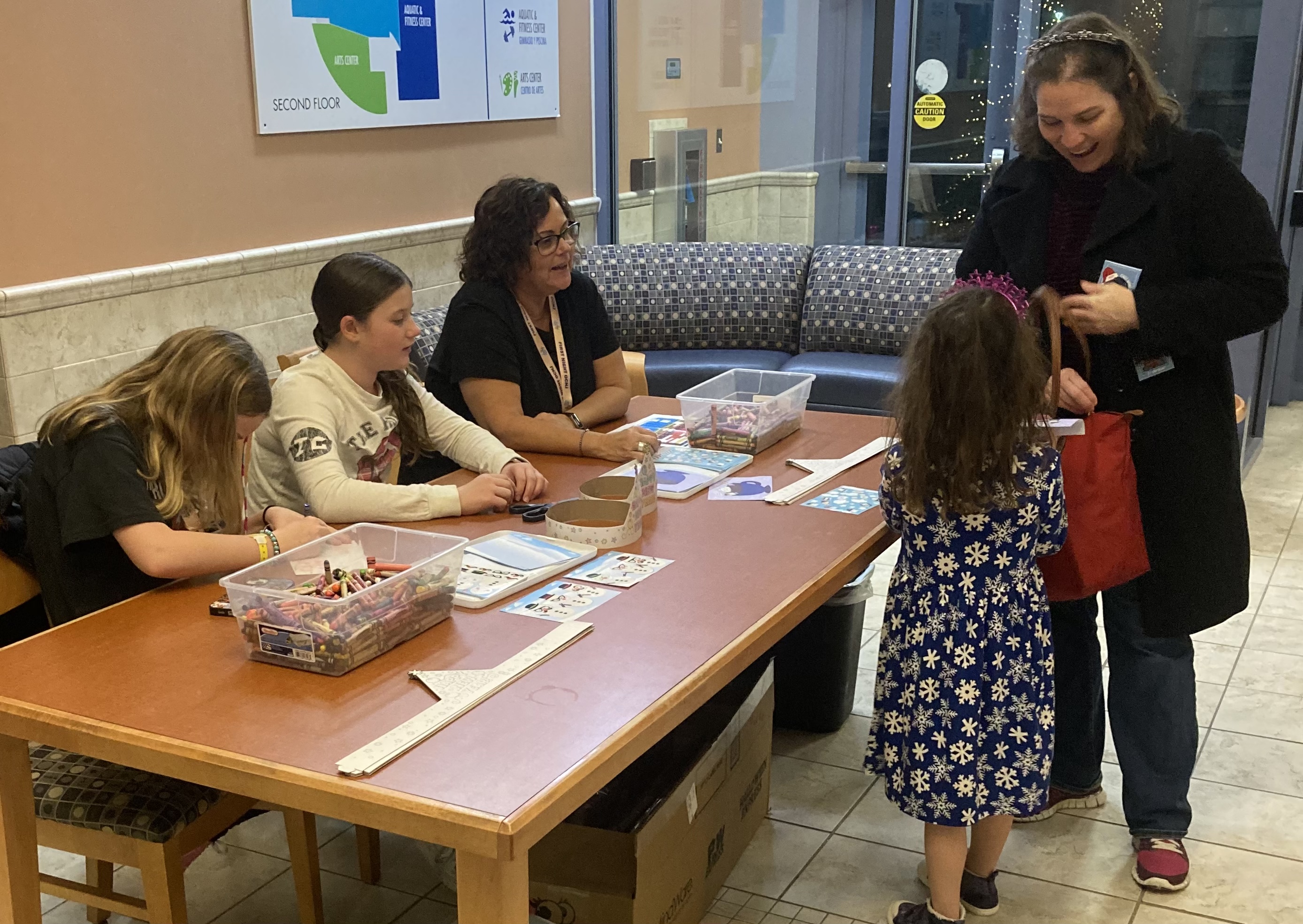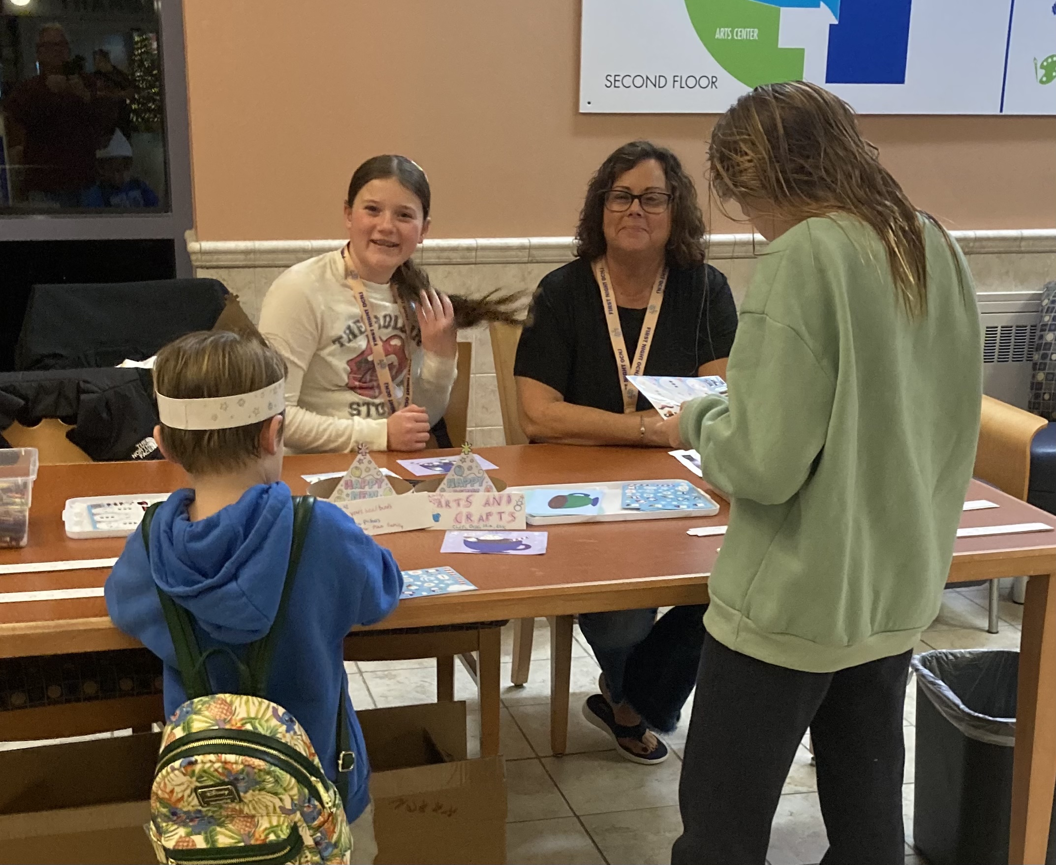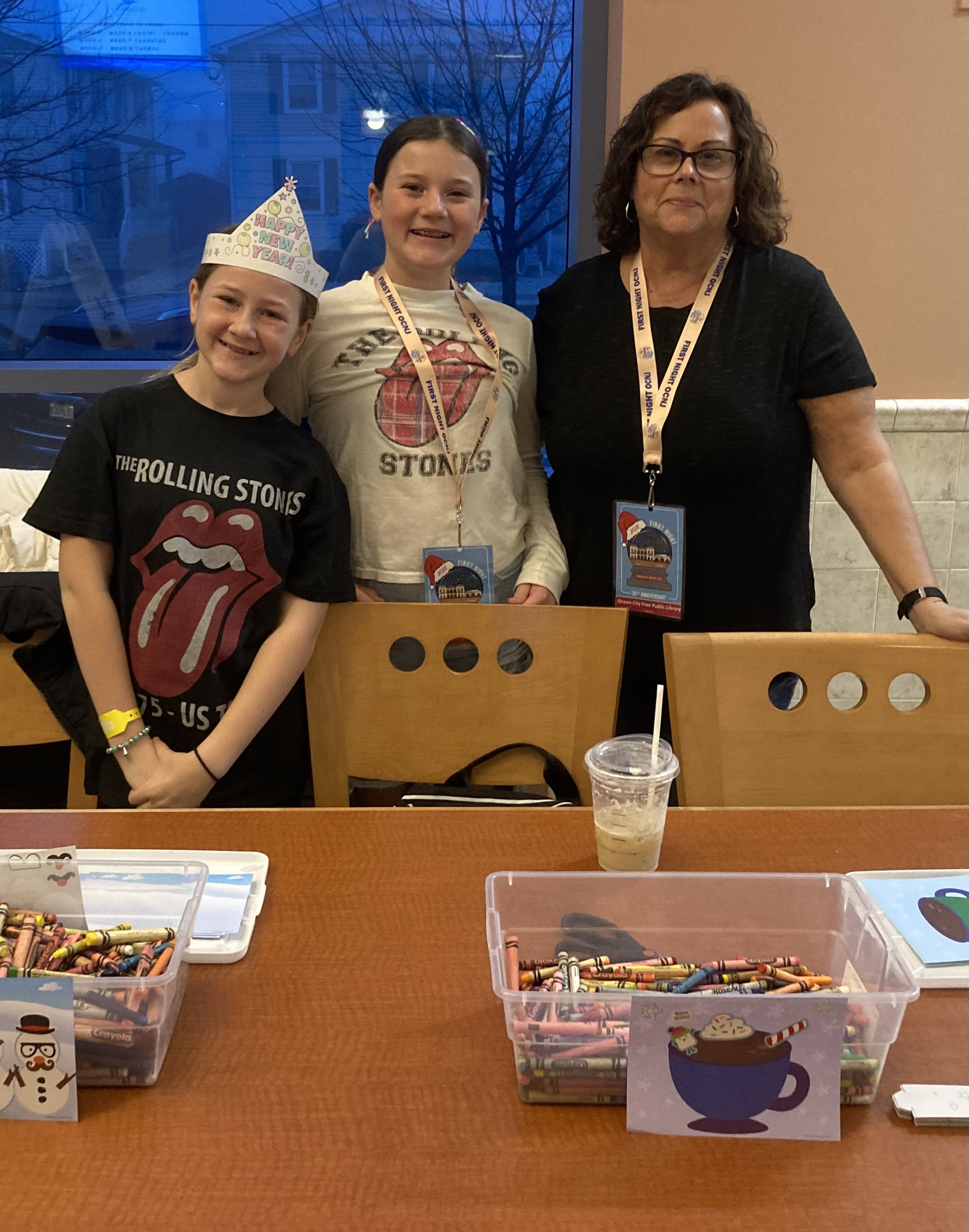 One of the functions of the Friends and Volunteers organization is to support the library in community activities. Here F & V member, Cheri Venturi, and her granddaughters Mia and Elise help at the craft table during First Night activities at the library.