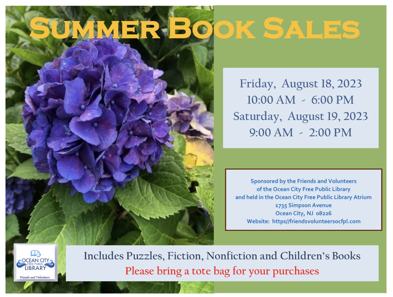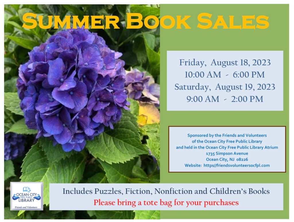 July 30, 2023 August Book Sale Leave a comment The final book sale of the summer will soon be here. You are welcome to browse and discover books of interest for every member of the family. Please bring cash and a tote bag for your treasures. Share this: Share on X (Opens in new window) X Share on Pinterest (Opens in new window) Pinterest Print (Opens in new window) Print Email a link to a friend (Opens in new window) Email Share on Facebook (Opens in new window) Facebook Like Loading... Related Posted by fvwebcreate in Post