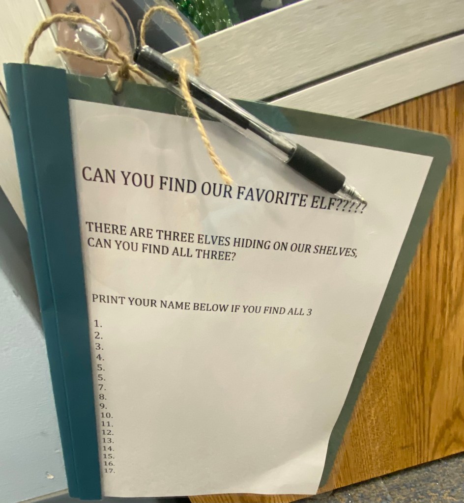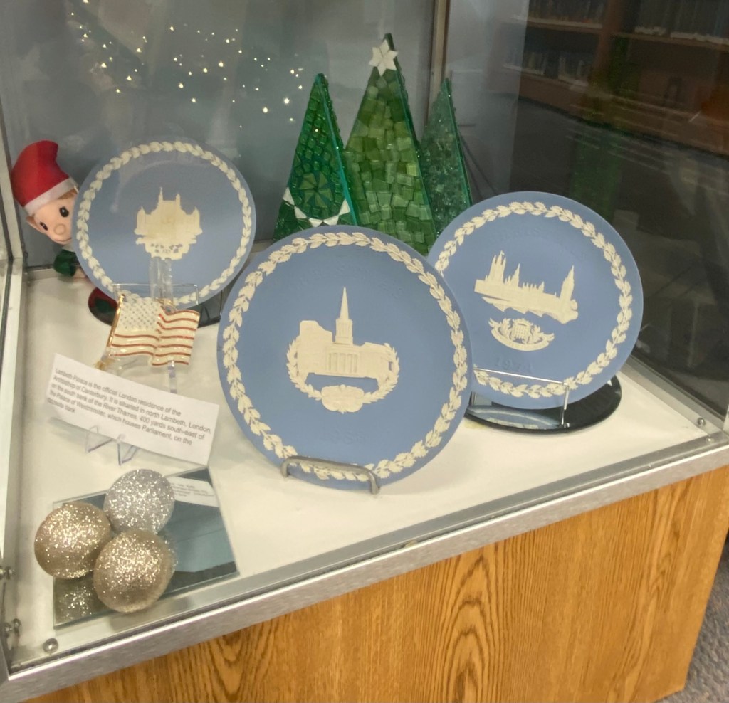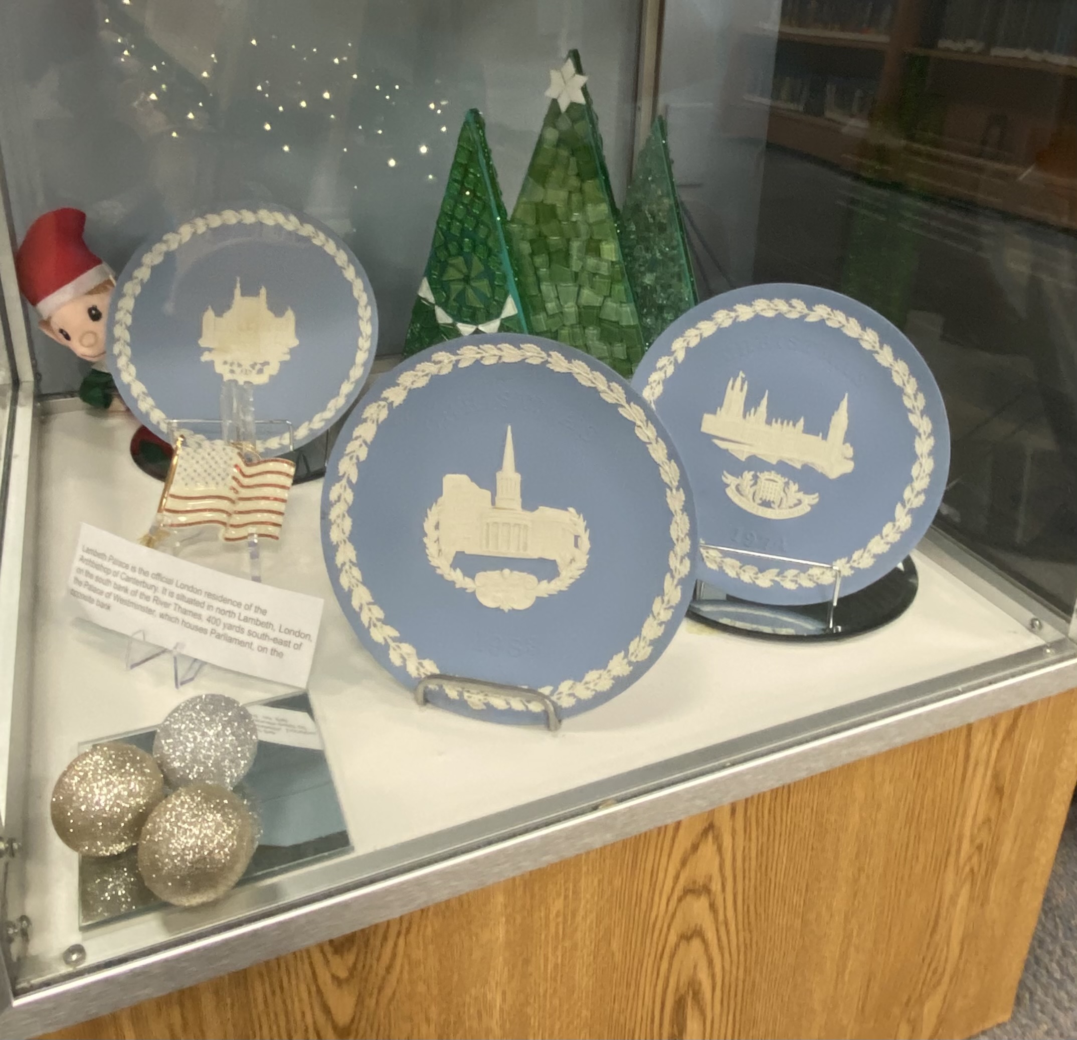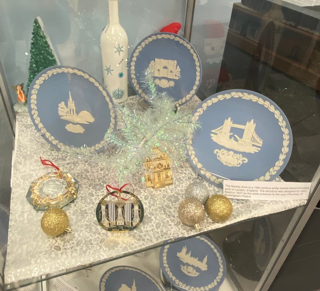 The display case is decorated for the holiday season with Wedgwood Christmas plates on loan from Pat Lewis, White House Christmas ornaments on loan from Marie Platzer and Mosaic Christmas Trees on loan from Lucy Eiselen and Anne Cancelmo. Viewers have been challenged to find three elves in the display.