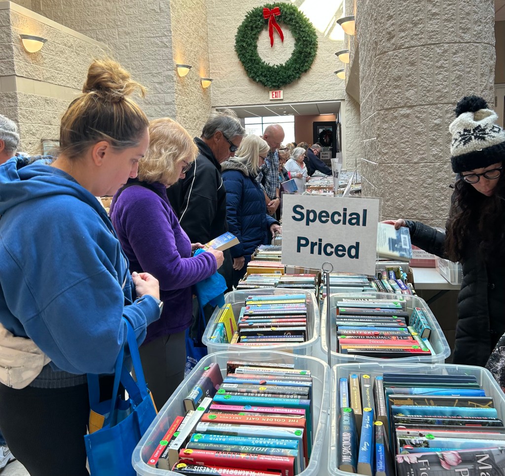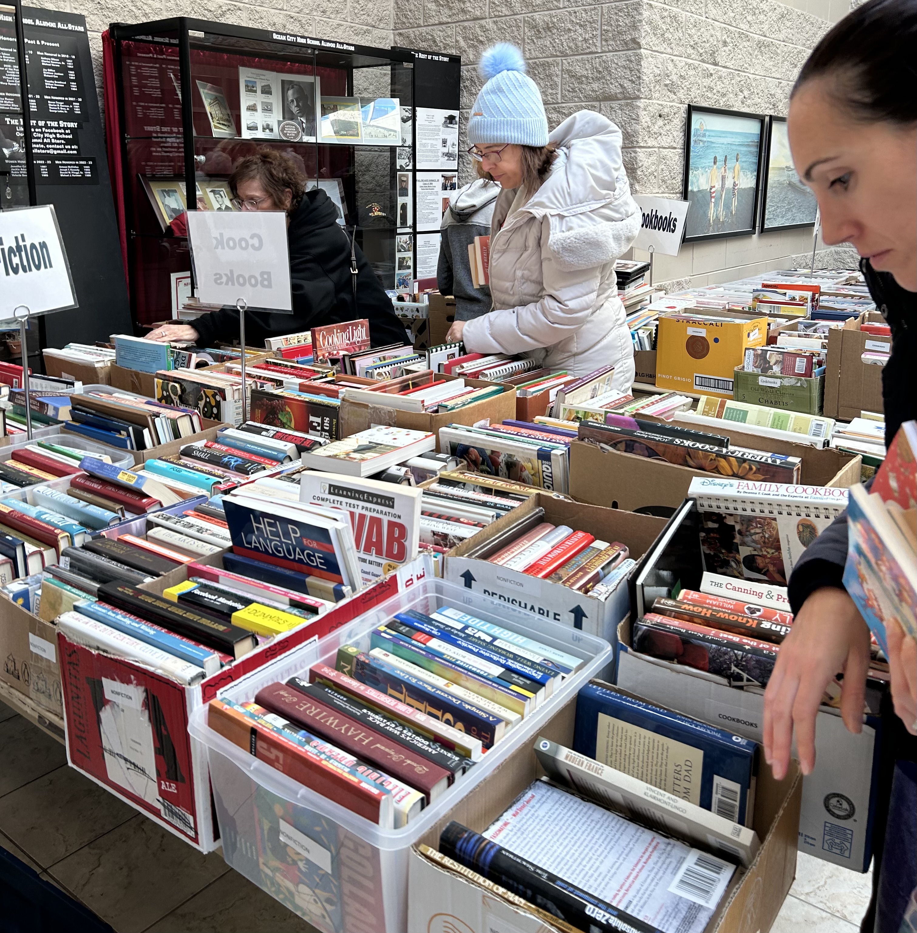Many hours are spent preparing for each book sale. Members sort and prepare the donated and discarded books for many weeks before each sale. The Friends and Volunteers along with the help of volunteers from the American Legion and the high school National Honor Society set up the sale in the atrium of the community center for the two day sale. The book sales are very popular and proceeds from the event support the many programs sponsored by the F & V.