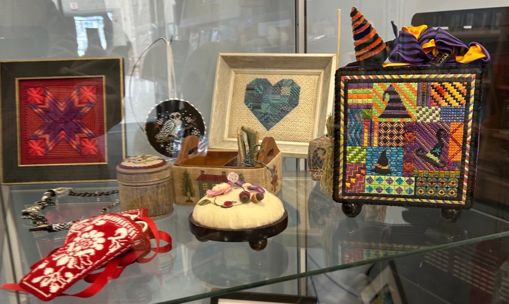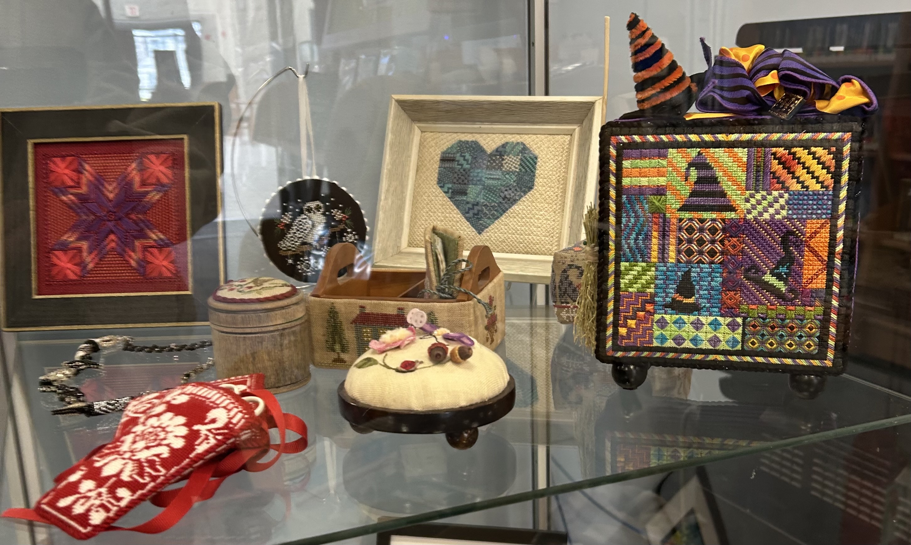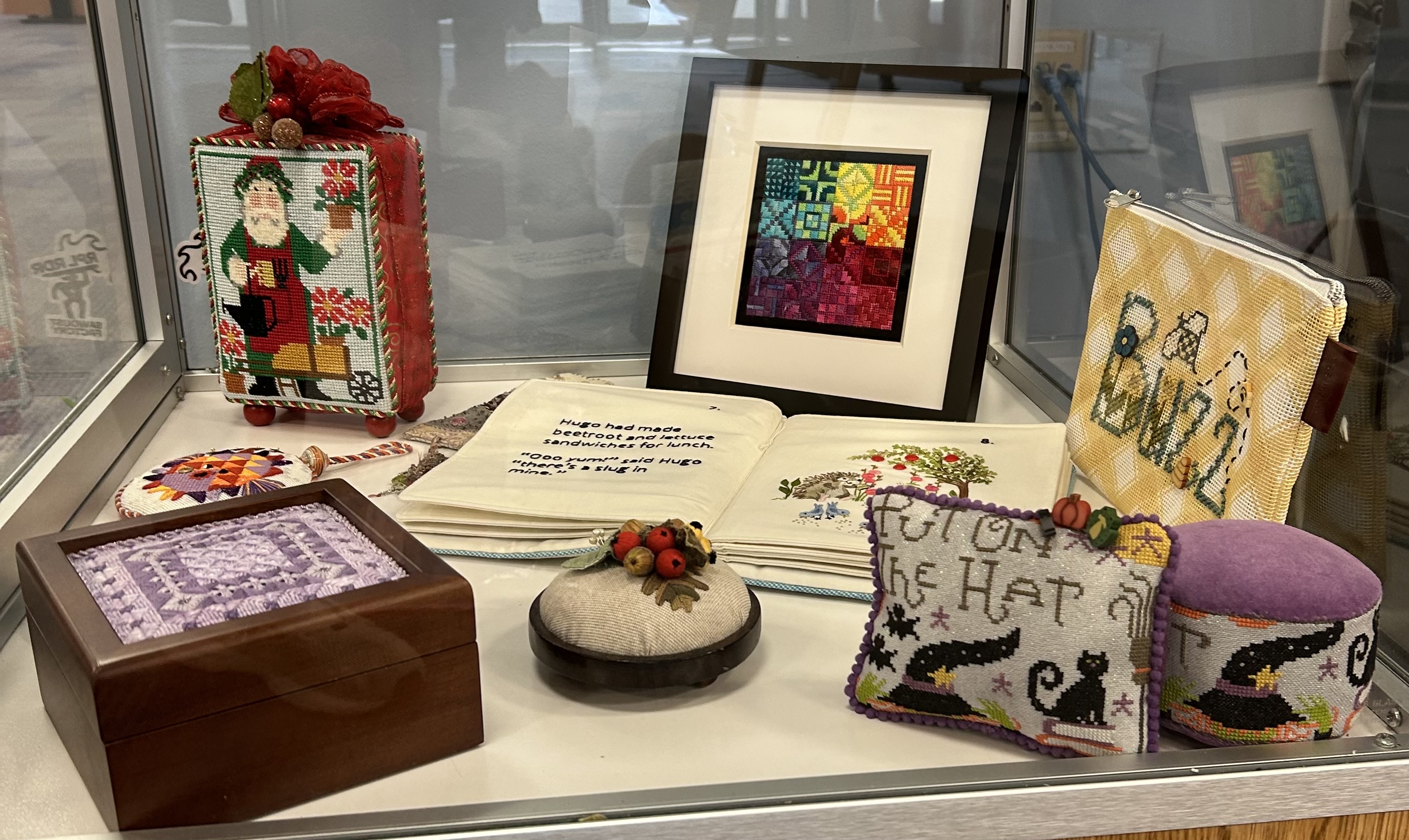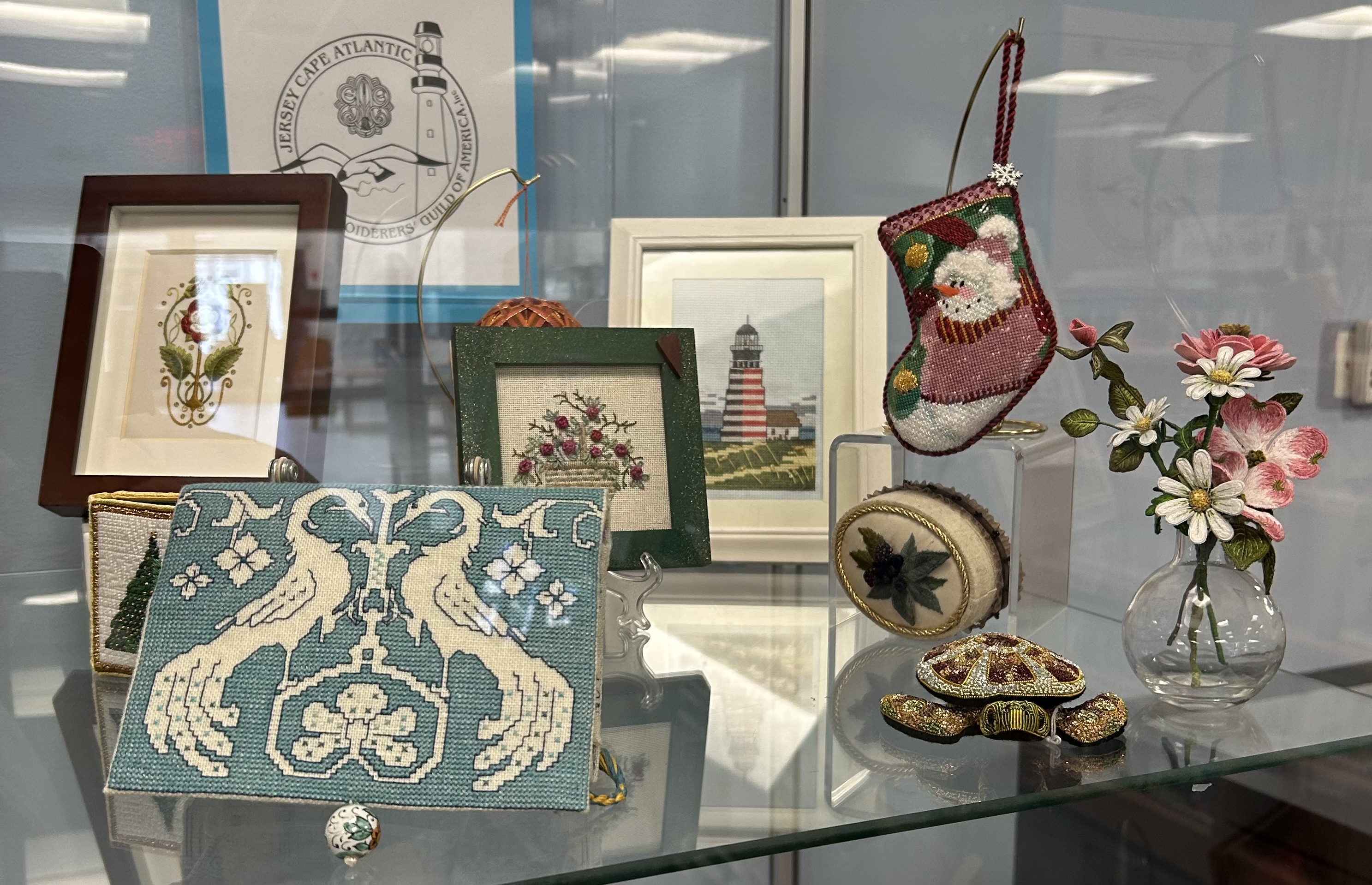 The Jersey Cape Atlantic Chapter of the Embroiderers’ Guild of America has filled the display case with their creations. It is a not-for-profit organization dedicated to the study and preservation of the art of embroidery. They also share their talents with the third grade students who participate in our Family Literature program by providing them with hand crafted bookmarks.