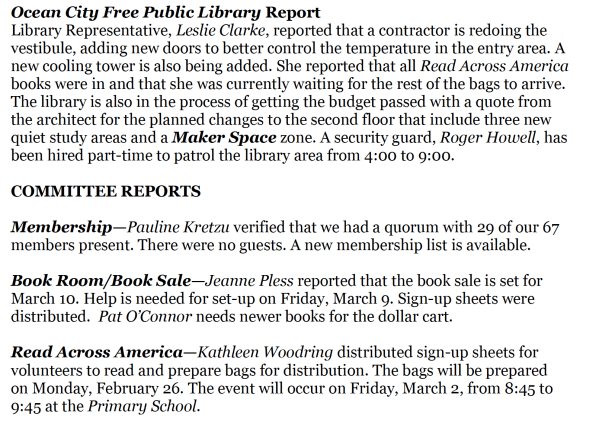 Hospitality—Joan Sambucci reported that National Library Week will be April 9 – 13. A sign-up sheet was distributed for volunteers who are needed to greet patrons, give away freebies, and collect chance slips for the beach tag drawing. Two shifts of volunteers are needed each day from 9:00 – 10:30 and 10:30 – 12:00.