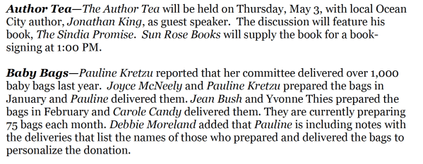 Book Room/Book Sales—Jeanne Pless reported that the one day sale was successful. The next sale is on June 22. Sorters were asked to keep aside any donated coffee table books for an upcoming silent auction.