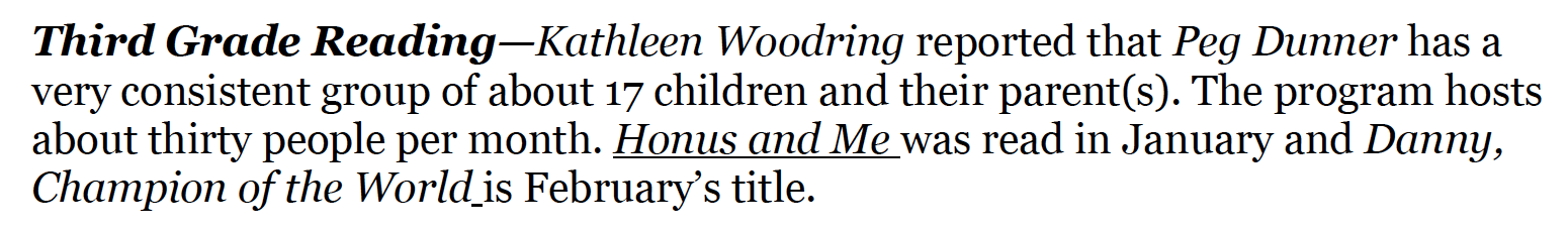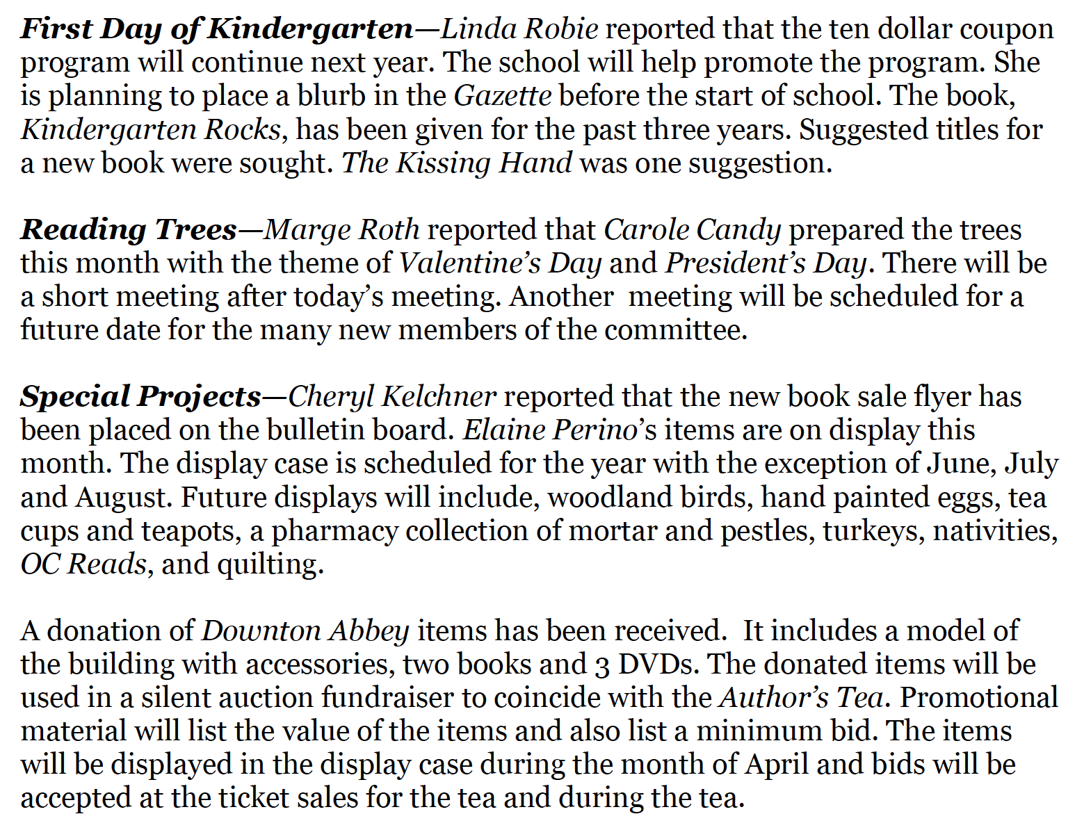 Third Grade Reading—Kathleen Woodring reported that the students are reading, How to Steal a Dog. The last meeting of the year will be held in April and will involve a wrap-up party.