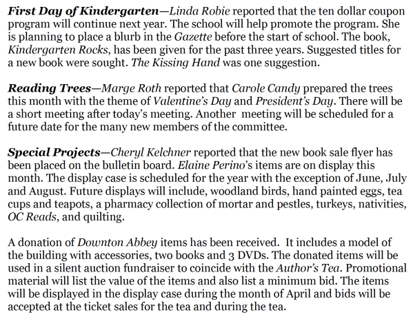 Special Projects—Cheryl Kelchner reported that the display case will feature an Easter theme with hand painted Easter eggs from the collection of Donna Brumell. The bulletin board in the atrium has also been redesigned with a spring theme. The donated Downton Abbey materials, to be used in the silent auction, will be displayed during April. Bids will be accepted at the ticket sales for the Author’s Tea, and a clip board for bids will be kept behind the second floor reference desk from April 21st to May 2nd. All of the materials are worth around $300. Starting bid will be $30.