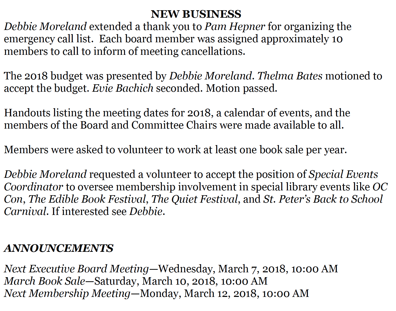 Debbie Moreland announced that Babs Stefano volunteered to be the Library Special Events Coordinator and Bobbi Taylor volunteered to assist.